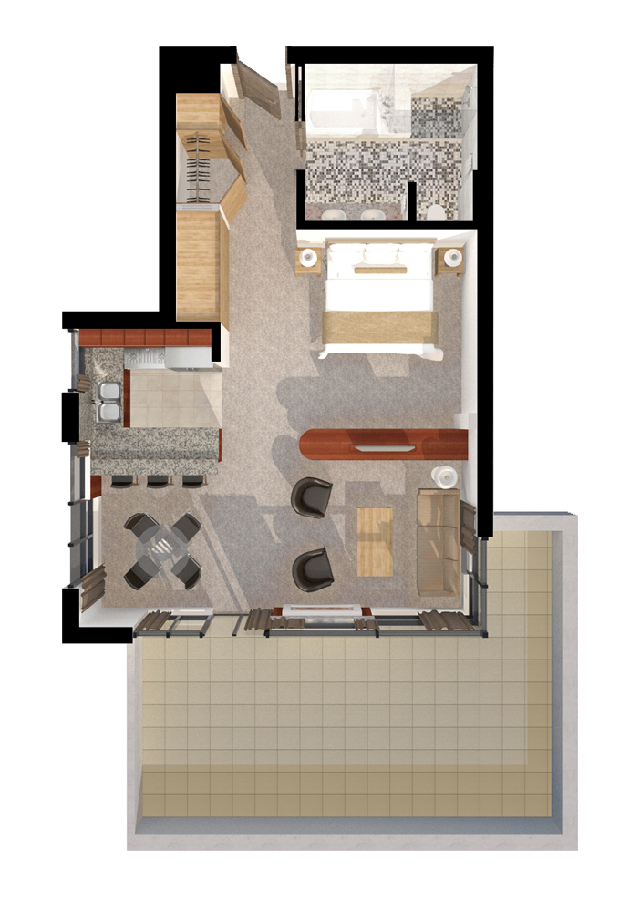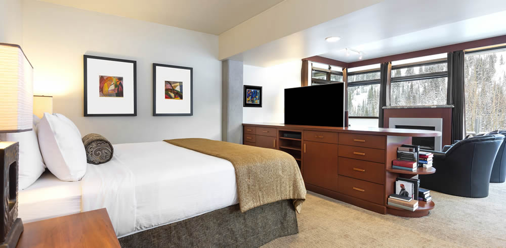 Located on the second floor, the suite has a heated private deck with a full mountain view and a small kitchen and dining area.
